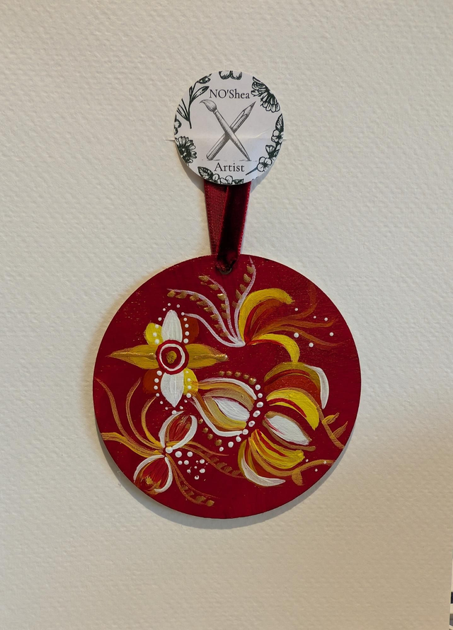 This hand painted wooden decoration is a one off. Painted in bright acrylica and varnished. It comes in a presentation bag. Makes a perfect gift.