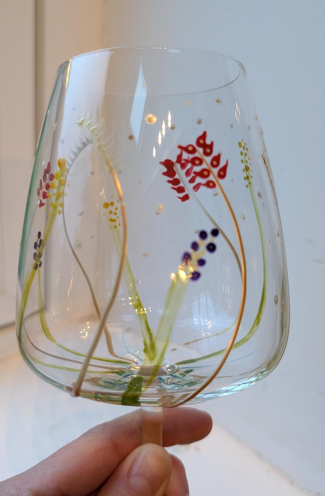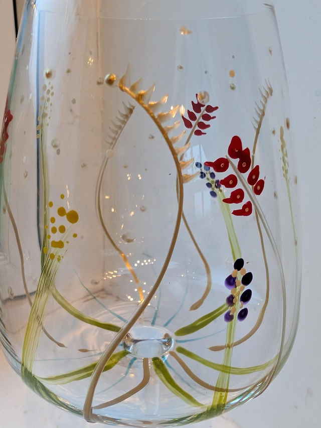 Hand embellished wine glasses. Only two available. Dishwasher safe