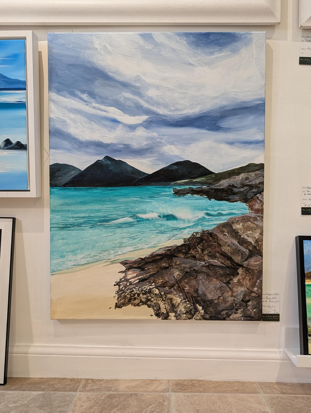This original painting captures the rocks in the foreground against the beautiful greens of Harris. This piece measures 24" x 32". It can be framed at an additional cost.