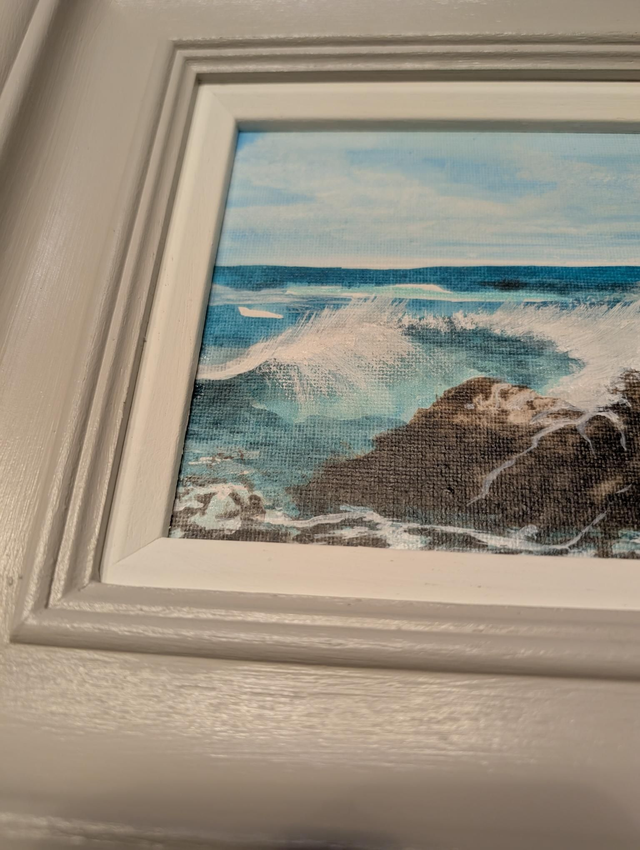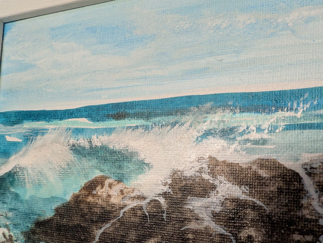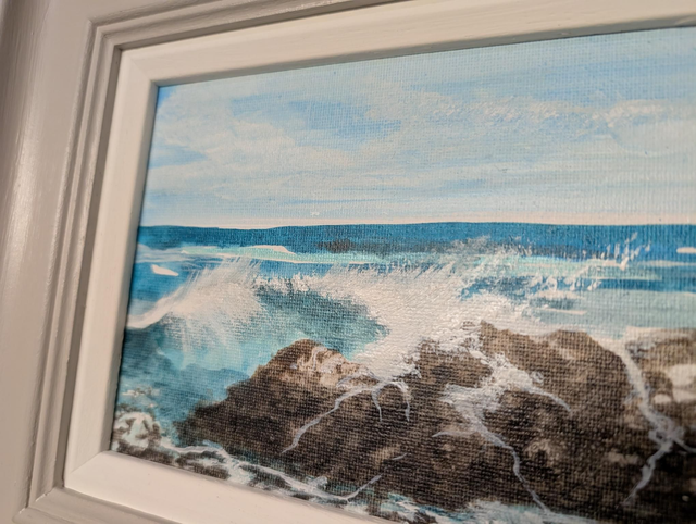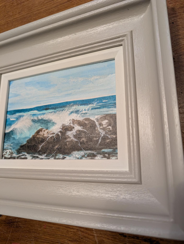 This is an original study in acrylics, capturing crashing waves on the rocks, Bernaray. A framed original. 10" x 12"