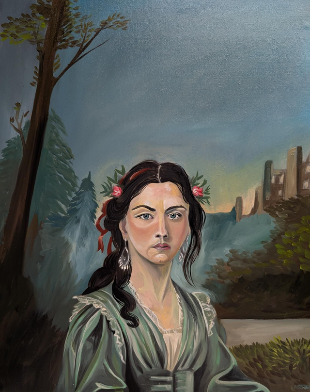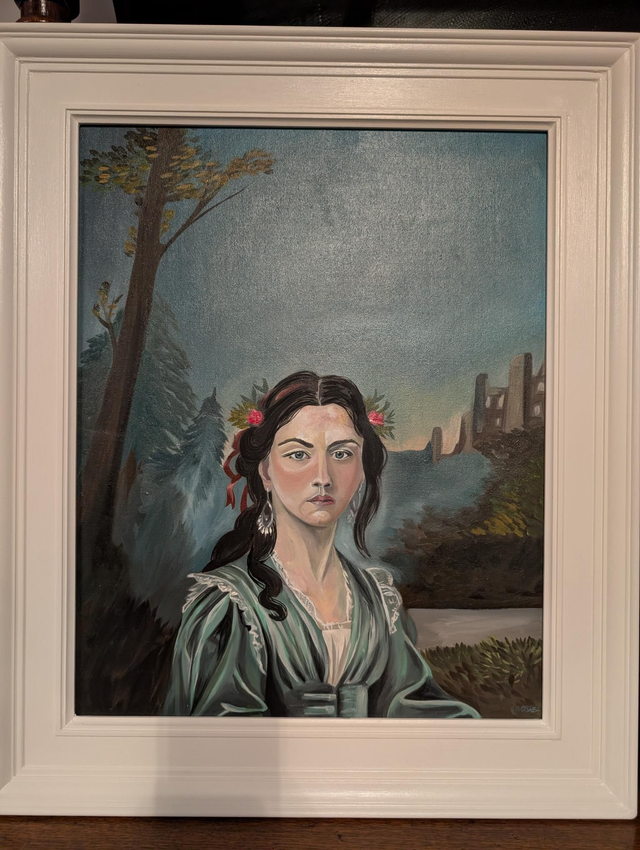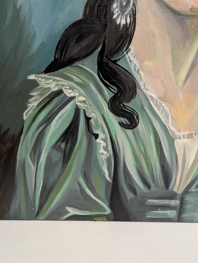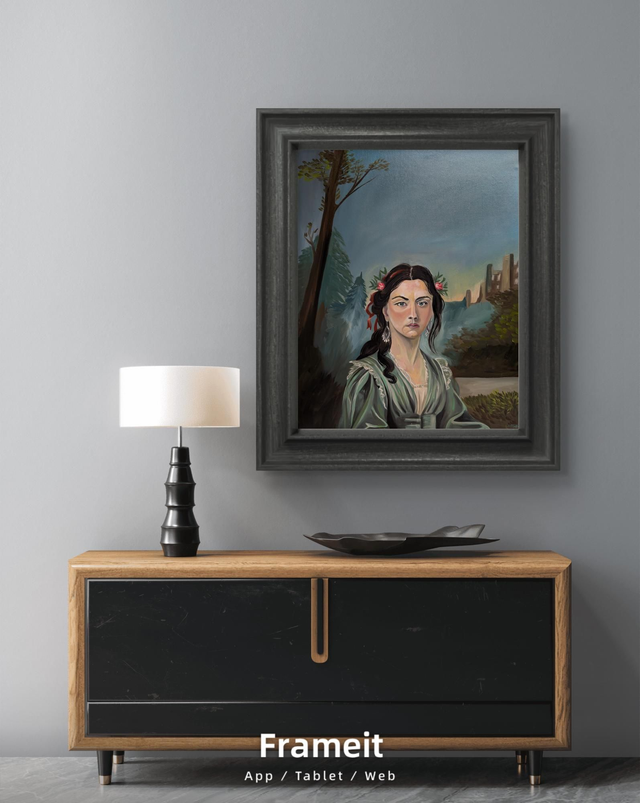 This original framed Oil painting is 21" x 25" with bespoke black wooden frame. This is part of a new series of women in portraiture with a look back in history and possible past life memories. Only one available but two sizes of signed Giclee Prints available.
