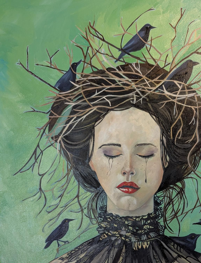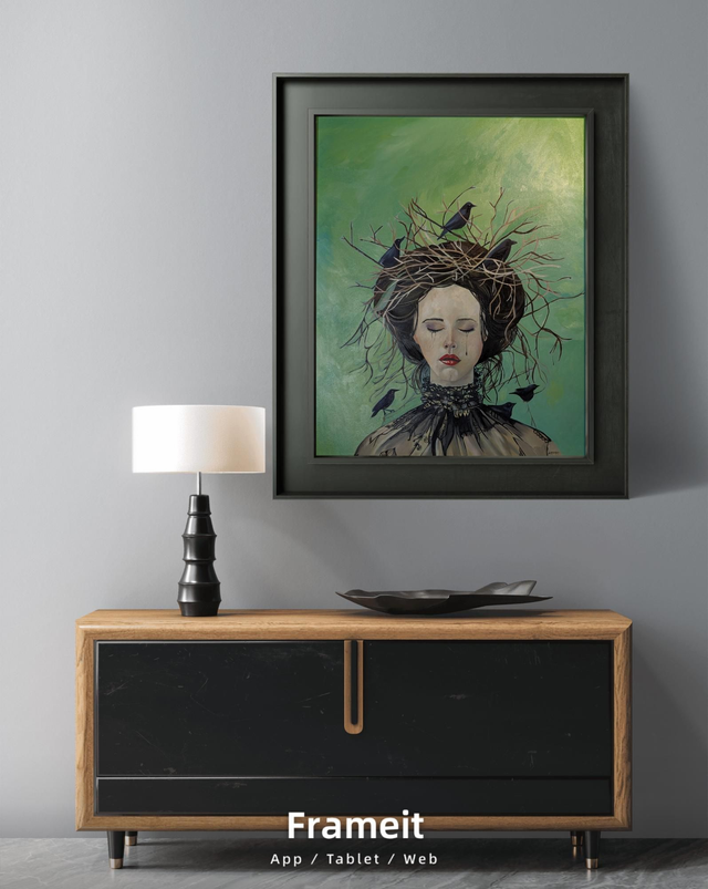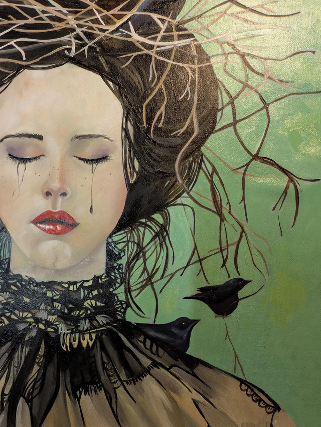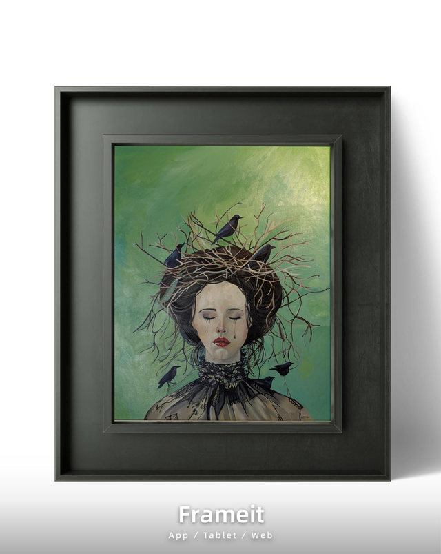 This beautiful portrait tells a story on its own. Deeply moving and reflective. A portrait of a girl with a gathering of crows. The original oil painting comes framed and is 21" x 25". Mounted Giclee Prints available too.